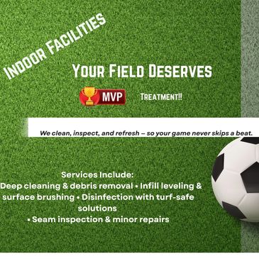 Indoor Facilities Services Include: • Deep cleaning & debris removal • Infill leveling & surface brushing • Disinfection with turf-safe solutions • Seam inspection & minor repairs